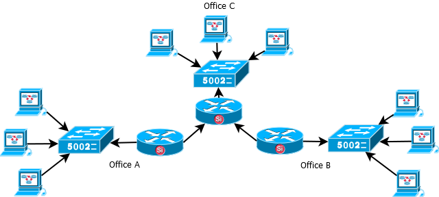 The image below illustrates a simple network topology where running a dynamic routing protocol might be preferable over static routes. In this scenario the users in Office A must be able to communicate with the users in Office B. There are 2 choices to make the communication possible and it’s either to summarize and create the routes from Office A to Office B through Office C or the use of a dynamic routing protocol. The second option, running a dynamic routing protocol requires an activation on all of the routers and what routes to distribute is up to the network administrator.