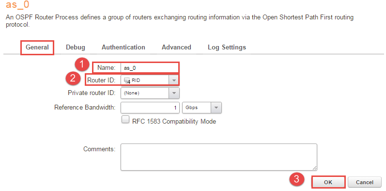 2, Under “Network -> Routing -> OSPF -> +Add -> OSPF Router Process” assign a name to it and add the object RID under “Router ID” as Figure 2 shows then press OK.