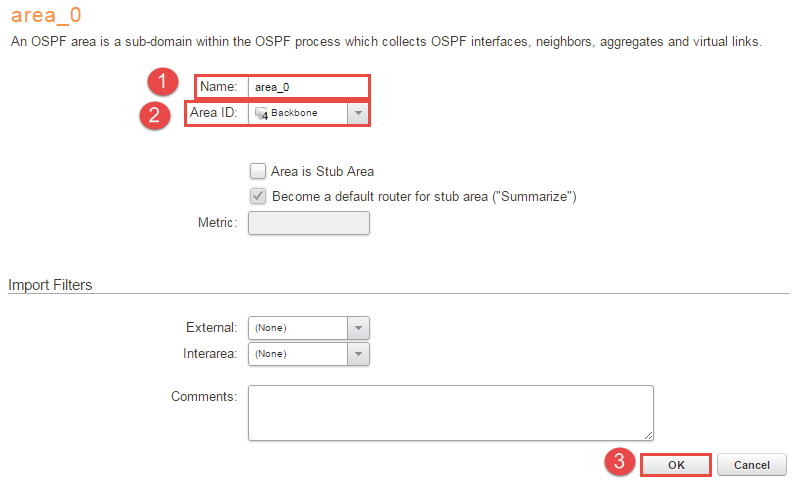 3, Under the newly created “as_0 -> +Add -> OSPF Area” and name it something convenient, in this case it’s called “area_0” and the Area ID should be the “Backbone” object that was created earlier. Look at Figure 3 for full configuration.
