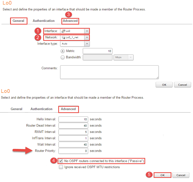 4, Under “area_0 -> OSPF Interfaces”, in this section two things will be added. First thing will be the networks that should be distributed to the other routers in area 0. To assign the address pool and interface go to “+Add -> OSPF interface” and add the interface / address pools. Go to the “Advanced tab” and check the box “No OSPF routers connected to this interface(“Passive”)”. The reasons why “No OSPF routers connected to this interface(“Passive”)” should to be checked is that if someone else connects a router it will not form convergence and the other reason is to decrease the CPU overhead. Figure 4 illustrates the configuration, please note that if the firewalls are in a cluster the router priority option MUST be changed to 0(An arrow in Figure 4 pointing towards it).