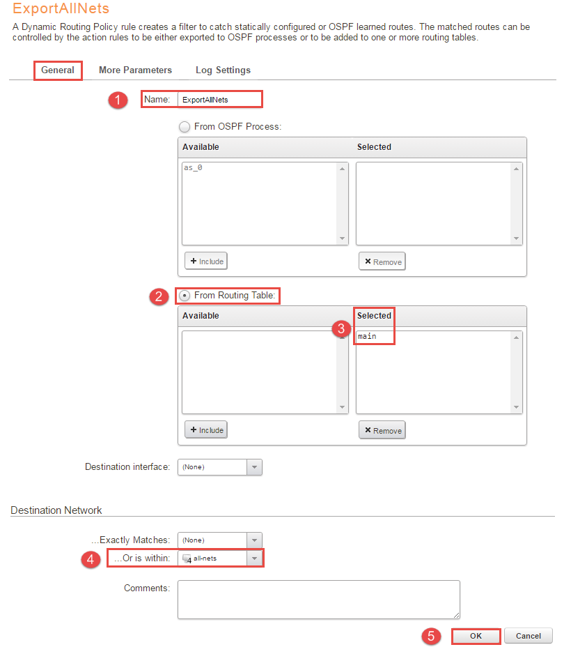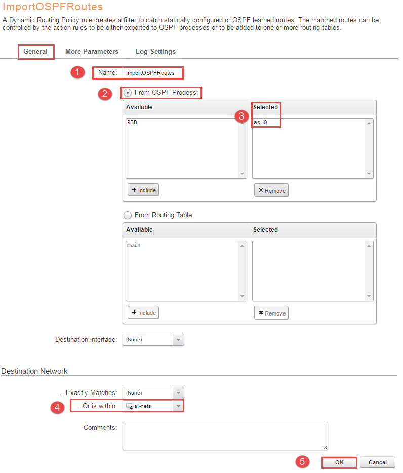 6, Next step is to import the routes from the AS into the routing table, in this scenario the main table will be used. Under “Network -> Routing -> Routing Rules -> + Add -> Dynamic Routing Policy Rule” name it something convenient, in this example the name is “ImportOSPFRoutes” and check “From OSPF process” and select “as_0”. Go to the “Destination Network” and select all-nets in “…Or is within:”. Figure 5 illustrates the configuration.