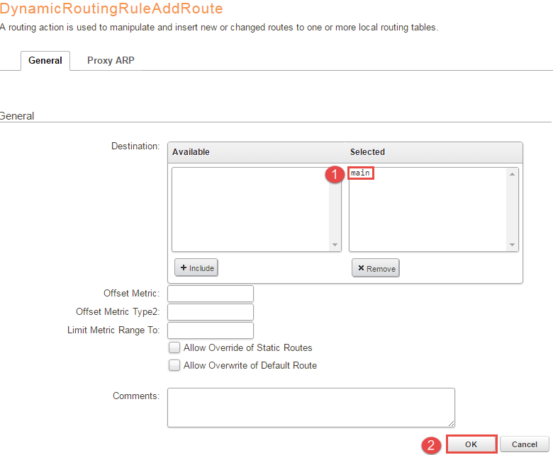 7, Under “ImportOSPFRoutes -> Routing Actions -> +Add - > DynamicRoutingRuleAddRoute” move “main” to the selected box and leave the rest of the values at their default, press OK. Figure 6 illustrates the configuration for clarification.