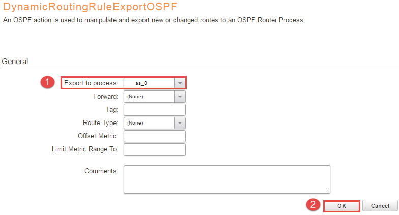One reason to why at least one dynamic routing rule is needed is that the routing table might contain sensitive information, so to avoid that the routing database gets published or picking up faulty routes a dynamic routing rule is needed. This rule is used to import the OSPF routes into the local routing table. One export rule will be created under part 8 to export the routes to the OSPF AS from the main table.