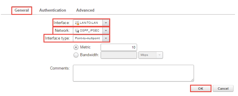 - Press “+Add -> OSPF Interface” and under interface pick “OSPF_LAN” and network “OSPF_Tunnel_net”, change the interface type to “Point-to-multipoint”, look on Figure 9 for clarification. Do note that if you’re running a HA change “Router Priority:” to 0 under advanced. Now the multicast will be turned off and the firewalls sends "hello" packets using unicast.