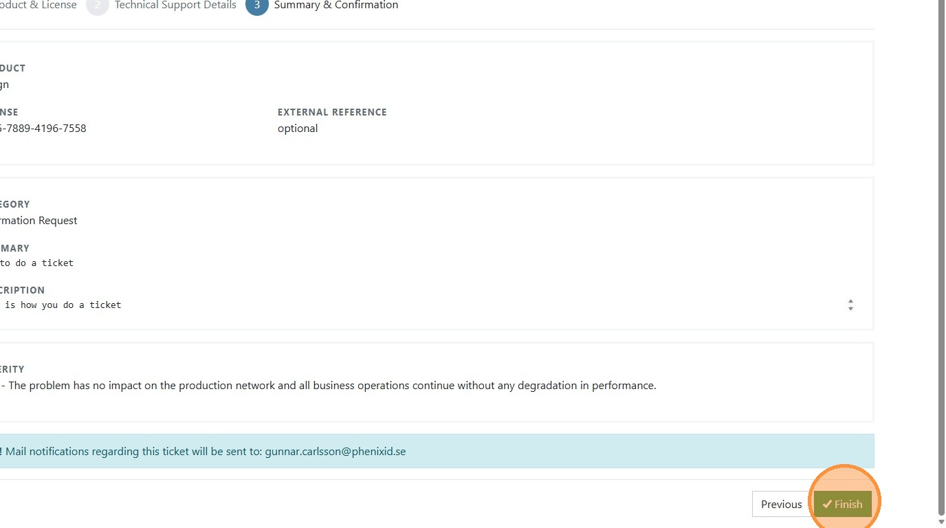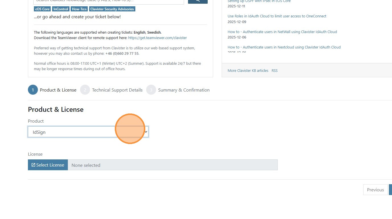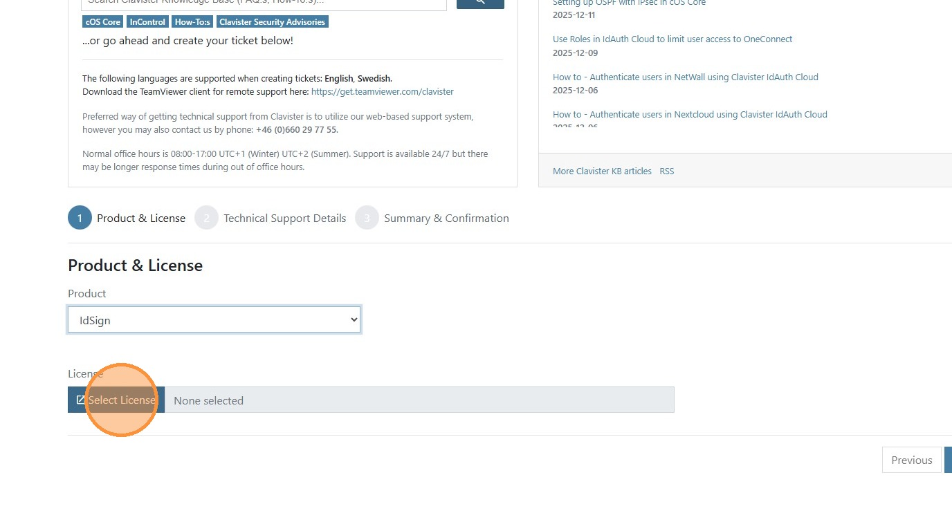 Select what product you want to open a ticket for then select license for that product / installation. Once selected press next.